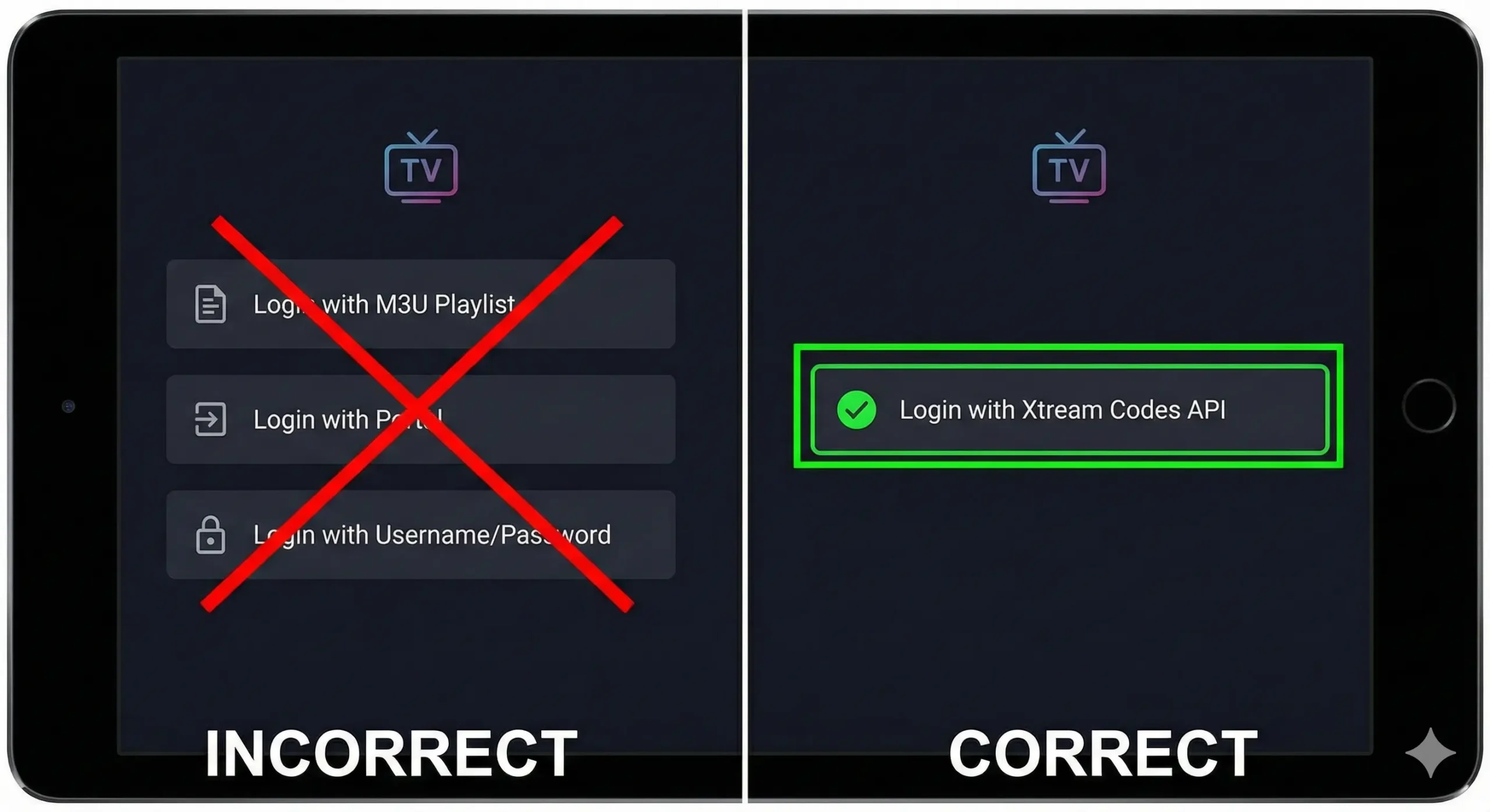 Always use the login method shown in this guide (usually “Xtream Codes API”).